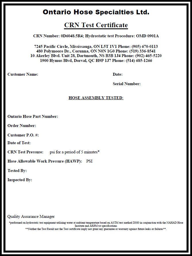 We certify hoses in accordance with applicable industry regulations and safety standards, including ISO, CSA, TSSA and CRN guidelines. - Custom Certifications