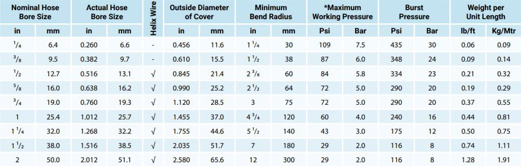109 PSI (7.5 BAR) for 1/4” to 29 PSI (2 BAR) for 2”