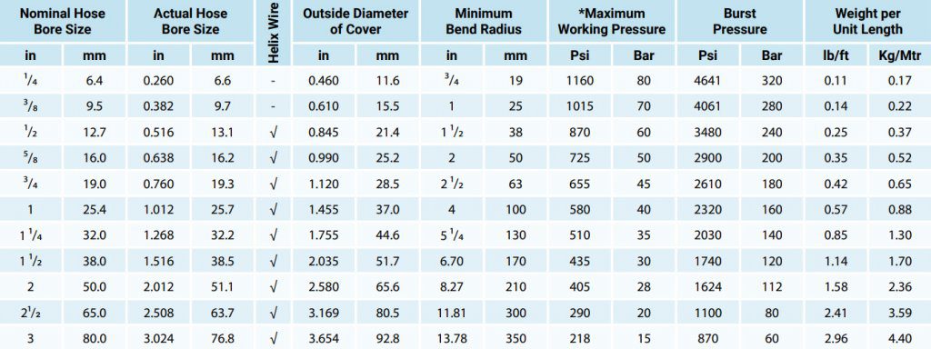 1160 PSI (80 BAR) for 1/4” to 218 PSI (15 BAR) for 3”