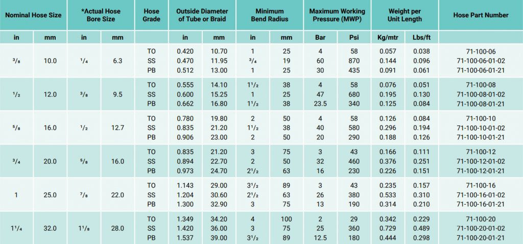 3/8” (10MM) = 870 PSI (60 BAR) TO 11/4” (32MM) = 25 BAR (360 PSI)